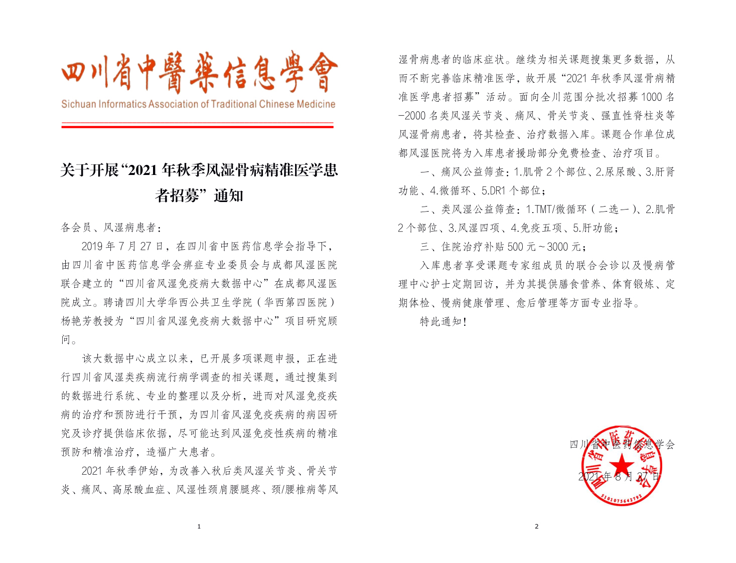 四川省中医药信息学会科研课题2021年秋季风湿骨病精准医学患者招