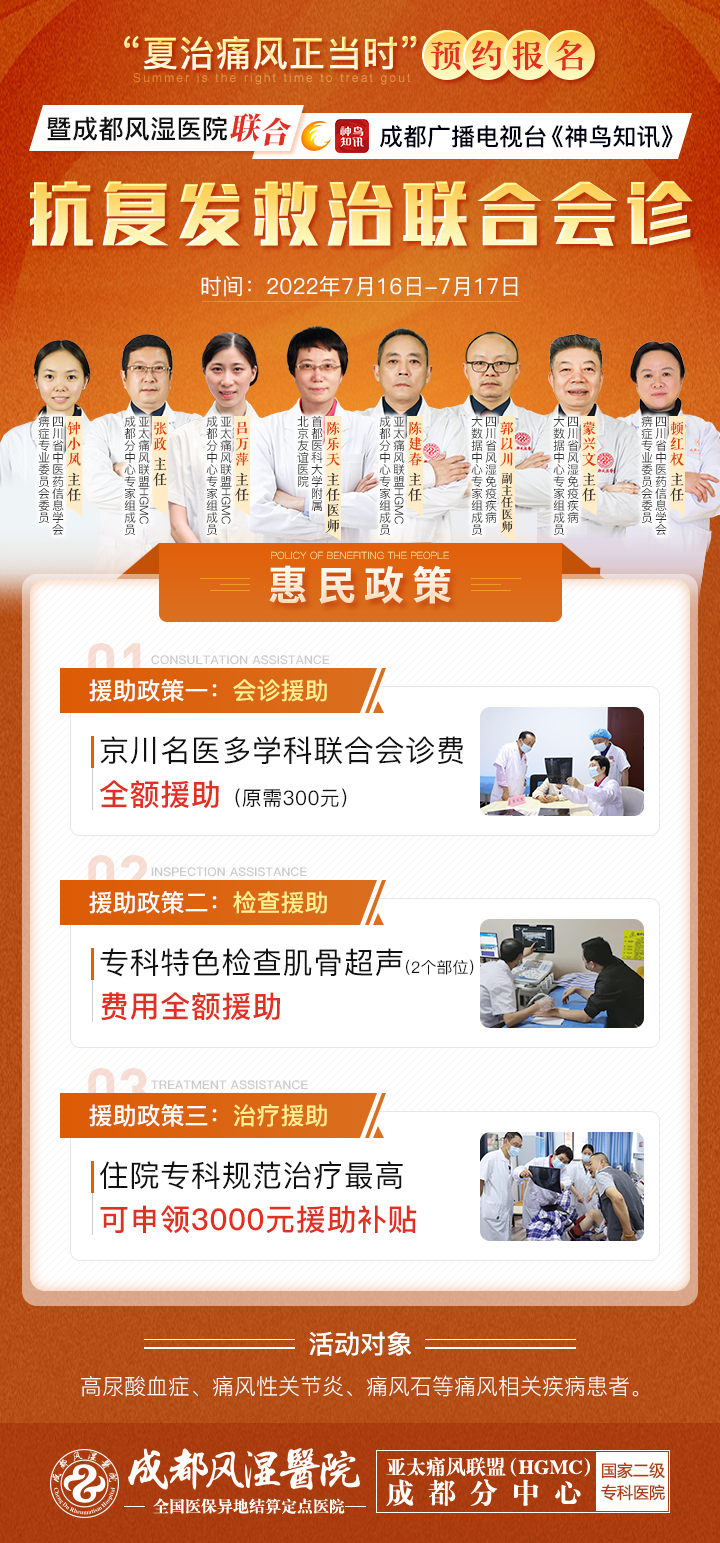 为帮助更多高尿酸血症、痛风性关节炎、痛风石患者,及时抓住“夏治痛风”黄金期,尽早摆脱疾病反复发作带来的健康、生活、工作等多方面影响,成都风湿医院联合成都广播电视台《神鸟知讯》抗复发救治公益活动,将于7月16日—17日特邀北京友谊医院陈乐天主任医师携手成都风湿医院门诊吕万萍主任、主任、陈建春主任、蒙兴文主任、钟小凤主任、主任、顿红权主任开展联合会诊,在夏季病症治疗的黄金时节,让更多患者获得系统规范的抗复发治疗,并在全国公开招募痛风患者,给予招募援助补贴,造福广大患者。具体内容如下: